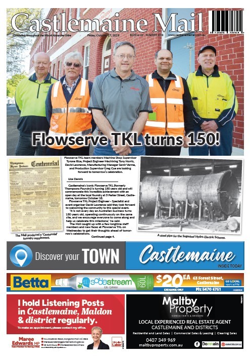 Castlemaine’s iconic Flowserve TKL (formerly Thompsons Foundry) is turning 150 years old and will commemorate this incredible achievement with an open day at the local foundry at 5 Parker Street, Castlemaine, tomorrow October 18. Flowserve TKL Project Engineer – Specialist and event organiser David Lawrence said they look forward to welcoming the community to this special event. “It is not every day an Australian business turns 150 years old, operating continuously on the same site, and we encourage everyone to come along and help us celebrate this milestone,” he said. The Mail caught up with a few longtime staff members and new faces at Flowserve TKL on Wednesday to get their thoughts ahead of tomorrow’s celebrations. Project Engineer Tony Norris will celebrate 45 years with the company in January. “I started at 15, and I am a fourth-generation employee at the foundry, and my son was the fifth. He has since moved on. My mum and dad actually met here so I wouldn’t exist if not for the foundry,” Tony laughs. “Mum used to clean the phones and Dad worked as a trade assistant. He spotted her, and it was love at first sight,” Tony said. Machine Shop Supervisor Tyrone Rice joined the company at 16 and will mark 48 years in January. “I think the biggest change I’ve seen here was the introduction of Computer Numerical Control (CNC) machines in 1980. It was a game-changer,” Tyrone said. Production Supervisor Greg Cue has worked at the business for 39 years. “I started at 17. I’ve enjoyed embracing the evolving technology over the years. You’ve got no choice but to keep up,” he said. “I have worked alongside the likes of Gordon Brown, who retired after 50 years but still plays a role six years on. The company has a strong community focus and has been happy to support organisations such as the CFA and SES and allow members to down tools and support the community when needed,” Greg said. Manufacturing Manager Samir Verna said he has only been with the company for five years, but has been warmly welcomed by the local team. “There are so many long-serving employees here with a wealth of knowledge and expertise in their fields; they are very generously passing that on to the next generation,” he said. The Open Day will run from 10am to 2pm. The well-known ‘whistle’ will sound across the town at 10am to coincide with the raising of flags on the Parker Street site and the gates will open. Thompsons Foundry Band will be performing, and there will be historical displays, a plaque unveiling by Lisa Chesters at 10.30am and free barbecue running throughout the day. Guests can also enjoy a PowerPoint presentation by longtime former employee and noted local historian George Milford. A number of other local organisations, including Billmans Foundry, Castlemaine Historical Society Inc and Maldon Vintage Machinery Museum, will be opening their days and holding events to coincide with the celebrations.