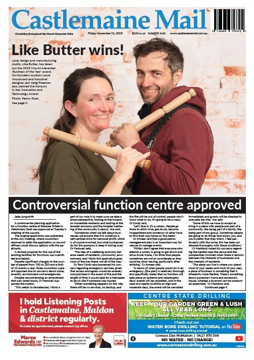 Local design and manufactoring studio, Like Butter, has taken out the 2025 Mount Alexander 'Business of the Year' award. Co-founders, sculptor Laura Woodward and industrial designer, Jem Selig Freeman also claimed the honours in the 'Innovation and Technology' award.
