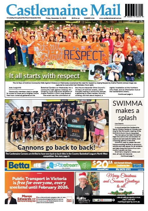The event was the culmination of the Mount Alexander Shire Council’s 16 Days of Activism events, which included making a community banner, a gathering to share recipes, biscuits, cooking, and talk about respect, a nightly installation at the Northern Arts Hotel, and an information hub at the Castlemaine Library.