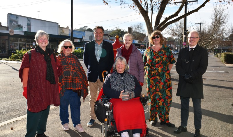 Back: Cathy Wheel from Mount Alexander Shire Disability Advocacy Group (MASDAG), Allison Nye President of Castlemaine CWA, Mayor Matthew Driscoll, Bendigo West MP Maree Edwards, Cr Rosie Annear and MASC CEO Darren Fuzzard. Front: Lorraine Le Plastier from MASDAG.