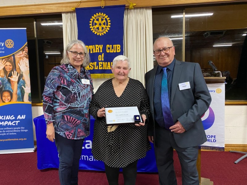 Rotary President Kerry Anderson is pictured with the 2024 Paul Harris Fellows Barb Templar and Grant Thomas.