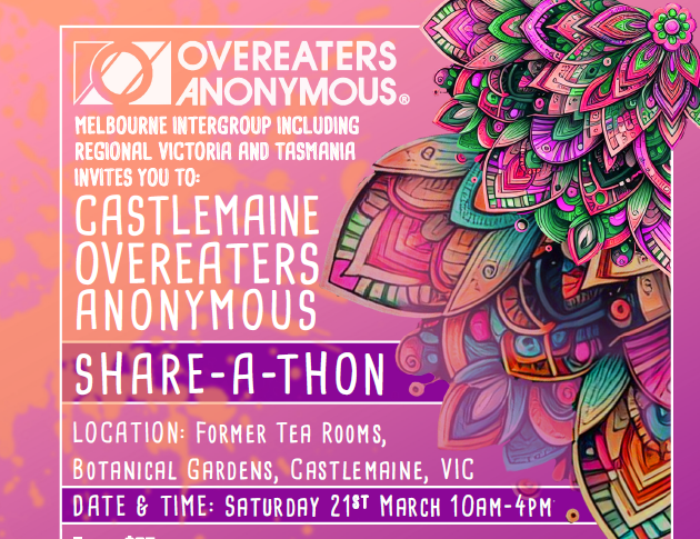 Melbourne Intergroup together with Regional Victoria and Tasmania invite you to the Castlemaine Overeaters Anonymous Share-a-thon tomorrow Saturday March 21 at the Tea Rooms at the Botanical Gardens, Castlemaine.