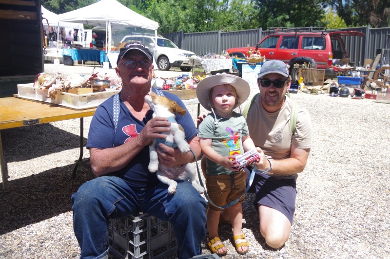 Andrew, Wyatt, Callan and dog Bosco enjoy a visit to the Wesley Hill Market. Photo: Max Lesser.
