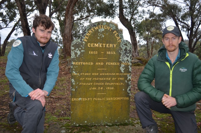 Parks Victoria Castlemaine team leader Ranger Lachlan Cullum and Ranger Laurence Farr are pictured with the memorial stone at Pennyweight Flat Cemetery.
