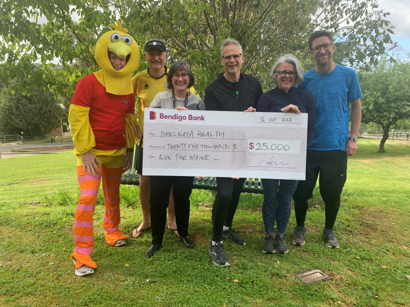Dr Richard ‘the Bird’ Mayes, Ed Griffin, Gavin Krasner, Jacqui Knee and Pat Smith representing the Run The Maine organising committee presenting a cheque for $25,000 to Dhelkaya Health CEO Sue Race (centre).