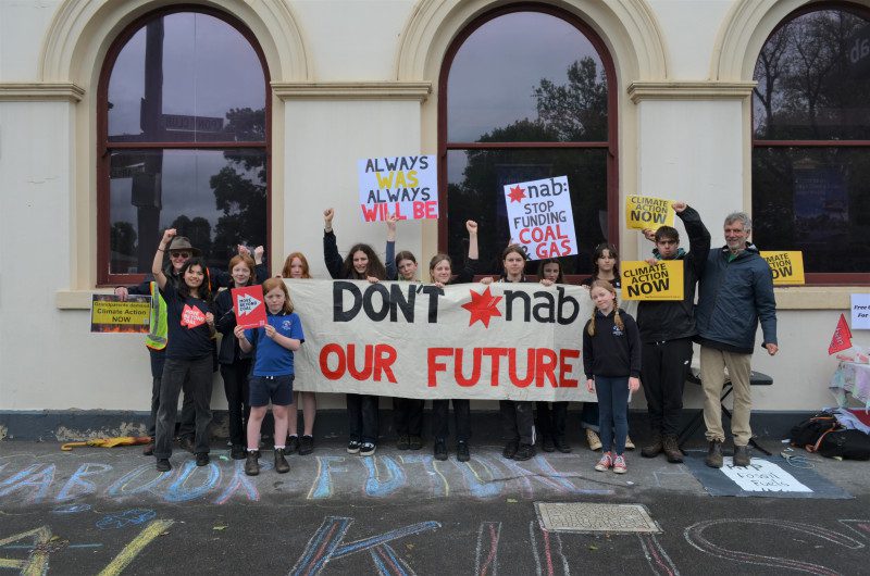 Student protesters gather outside the National Australia Bank in Castlemaine.