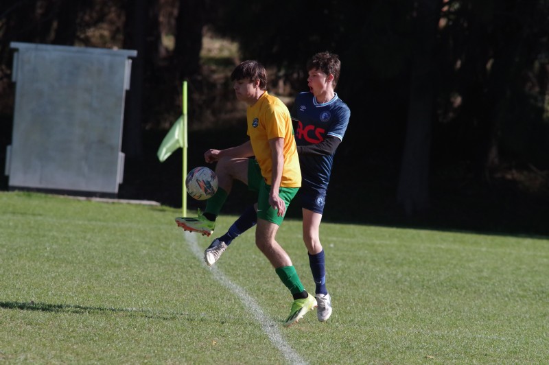 Castlemaine Goldfields Youth player Xavier Abicare works to fend off his Eaglehawk opponent. Photo: Max Lesser.