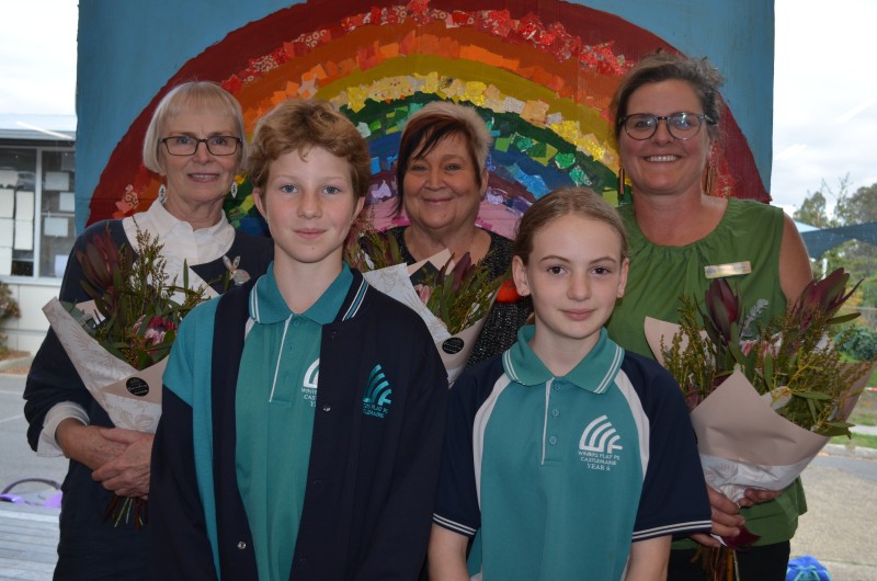 Long serving Winters Flat Primary School teachers Helen Weir, Karen Brooks and Fiona Johnston are pictured with students Aurora and Freya at Monday’s