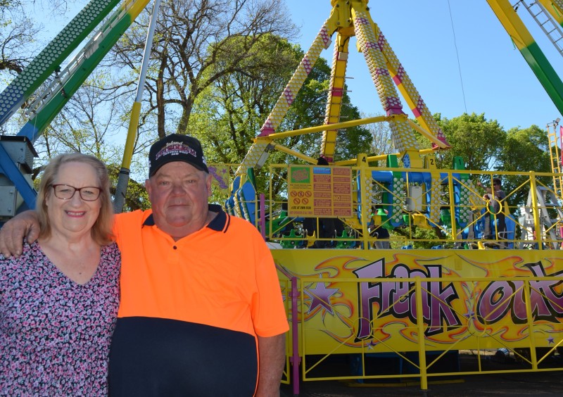 Castlemaine & District Agricultural Show Society secretary Debbie Hamilton and longtime attendee Frank 'Boy' Laurie are pictured with new ride Freak Out.