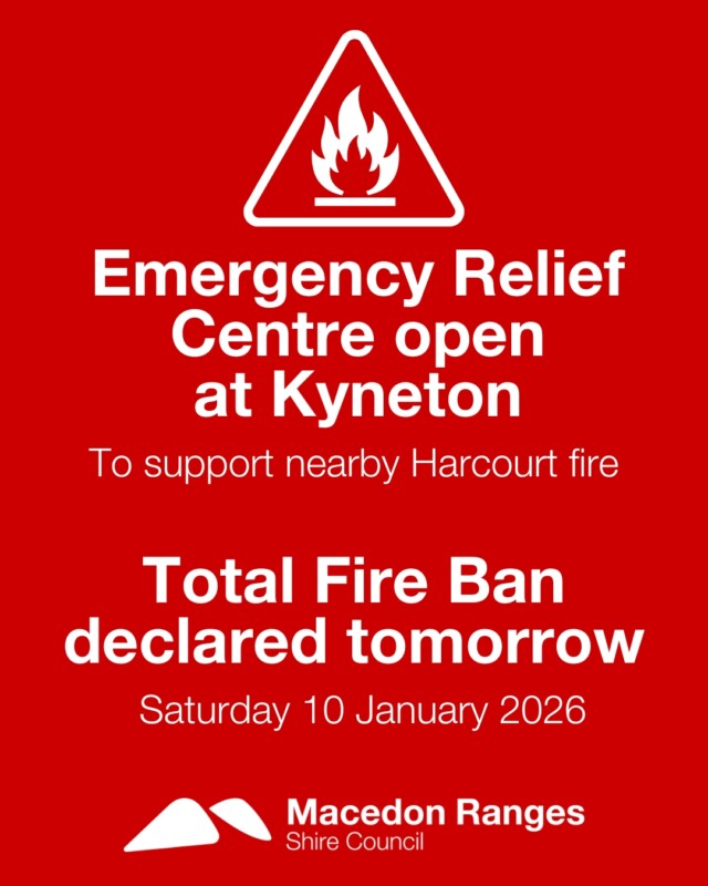 Macedon Ranges Shire Council has opened an Emergency Relief Centre (ERC) at the Kyneton Toyota Sports & Aquatic Centre (KTSAC), support its neighbours at Mount Alexander Shire Council and those impacted by the Harcourt fire to welcome anyone who needs to evacuate the fire and does not have a safe place to go.