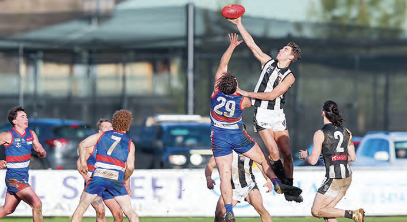 Castlemaine’s Brodie Brown-Kerr leaps for the ball as Gisborne player Ben Eagles attempts to intervene. Photo: Peter Banko.